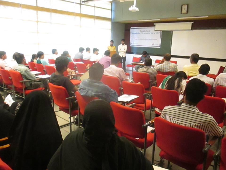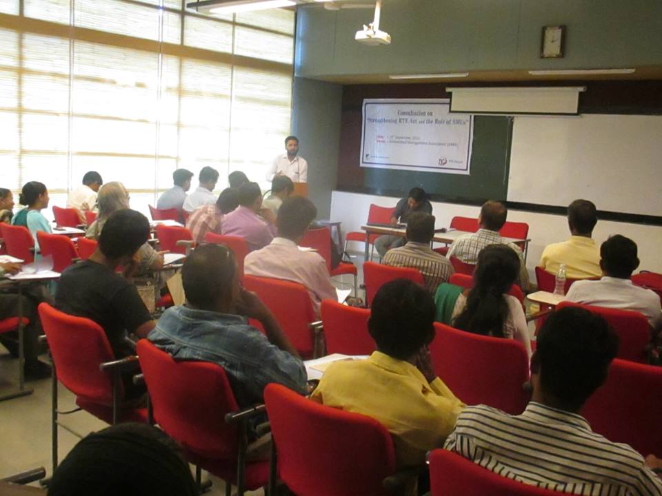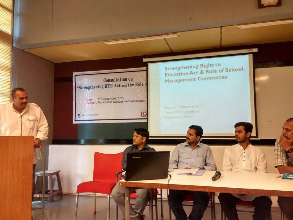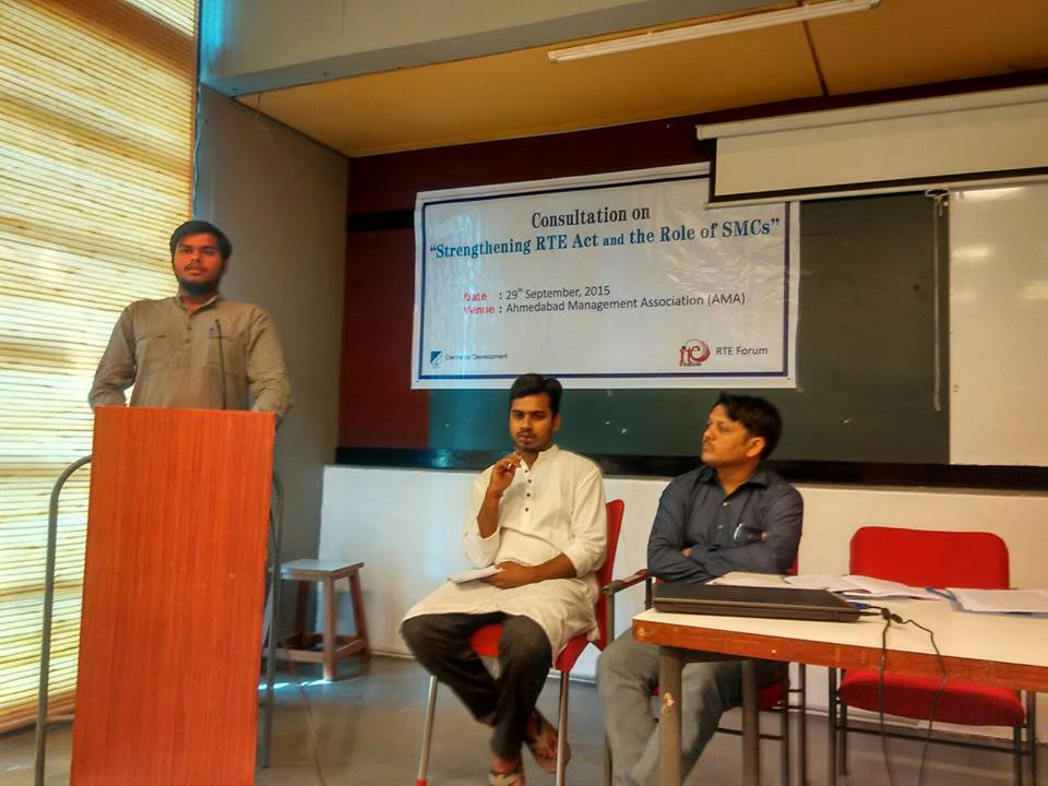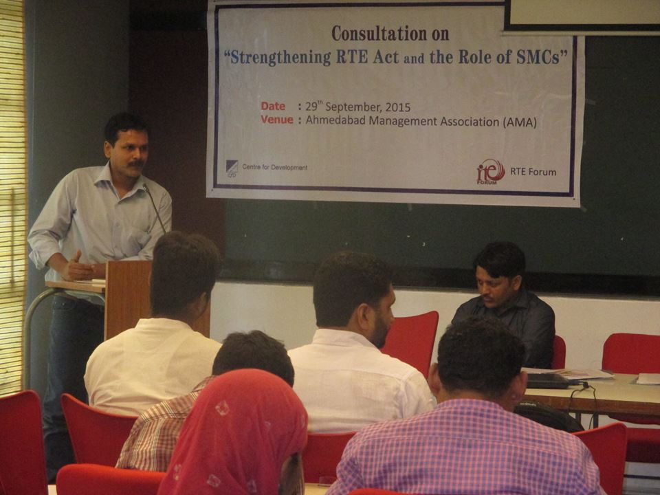 CfD with RtE Forum and RtE Resource Centre has organized a consultation on “Strengthening RtE and Role of SMCs” on 29th September, 2015 at AMA. Various people who have engage in strengthening RtE Act including SMC (School Management Committee) members, elected representatives and community leaders have participated actively. Action plan has been derived at the end of the consultation.